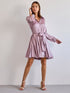 De satijnen jurk van Laffite met ceintuur en volumineuze ruches aan de onderkant verkrijgbaar in de kleuren fuchsia en nude.